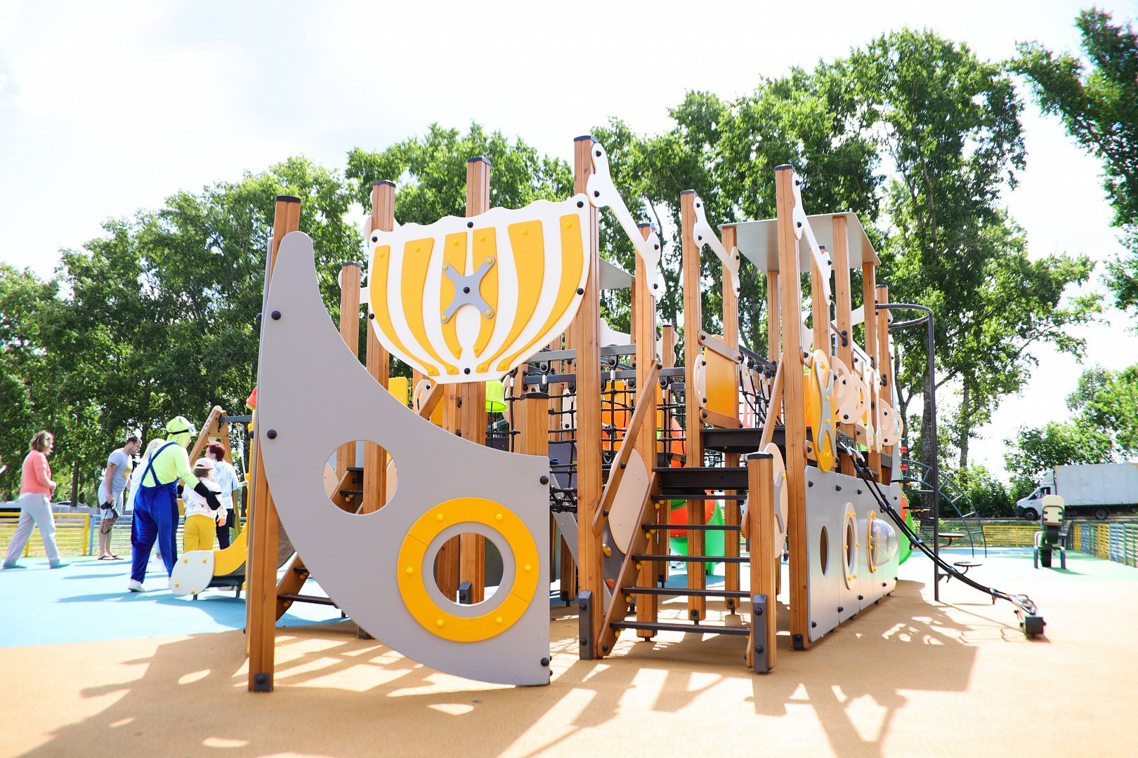 Площадь детского городка, выполненного в морской тематике, составляет 450 м2 и включает 12 игровых элементов. «Этот красочный современный комплекс с безопасным резиновым покрытием и качественными игровыми элементами можно посещать в любое время года», - отметил Артур Викторович.