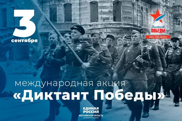 Московская область традиционно присоединится к проведению Диктанта.«Диктант Победы» проводится в рамках партийного проекта «Историческая память». Цель Диктанта – привлечение широкой общественности к изучению истории Великой Отечественной войны, повышение исторической грамотности и патриотического воспитания молодежи, привлечение внимания общественности и средств массовой информации к проблеме сохранения исторической памяти о Великой Отечественной войне.