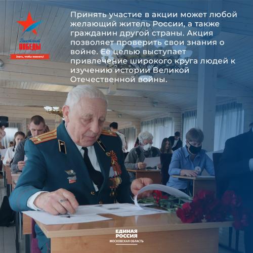 «Диктант Победы» проводится в рамках партийного проекта «Историческая память». Цель Диктанта – привлечение широкой общественности к изучению истории Великой Отечественной войны, повышение исторической грамотности и патриотического воспитания молодежи, привлечение внимания общественности и средств массовой информации к проблеме сохранения исторической памяти о Великой Отечественной войне.Диктант проводится в формате тестирования. Количество заданий Диктанта – 25. Время написания Диктанта – 45 минут. Все вопросы составлены профессиональными экспертами-историками Российского исторического общества (РИО). В них нужно будет узнать героев Великой Отечественной войны по описанию, расположить события в хронологическом порядке, по отрывку из мемуара полководца понять, о какой военной операции идет речь, определить название песни.