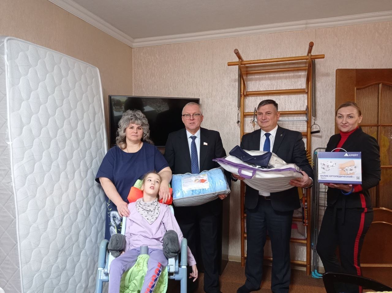 В рамках партийного проекта «Единая страна – доступная среда» единороссы совместно с представителями завода «Технониколь» посетили семью Серединых и подарили матрас, специальный утяжеленный плед и ортопедические подушки.У Ксении Серединой детский церебральный паралич в тяжелой форме. Родители, Оксана и Андрей, очень заботятся о дочке, ежедневно вкладывают в нее всю любовь и тепло, делая всё возможное, чтобы ребёнок был счастлив.