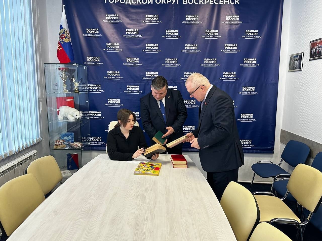 Председатель Совета депутатов г.о. Воскресенск Владимир Кузнецов совместно с руководителем Фракции «Единая Россия» в Совете депутатов Сергеем Слеповым передал русскую классику руководителю общественной приёмной партии "Единая России" Юлии Яковлевой в рамках акции "Книги - Донбассу".Данная акция проводится по всей стране совместно с Министерством просвещения. В ходе акции собранные книги на русском языке передаются в библиотеки, в том числе и школьные, Донецкой и Луганской народных республик, в освобождённые территории, а также в детские досуговые и другие социальные учреждения.