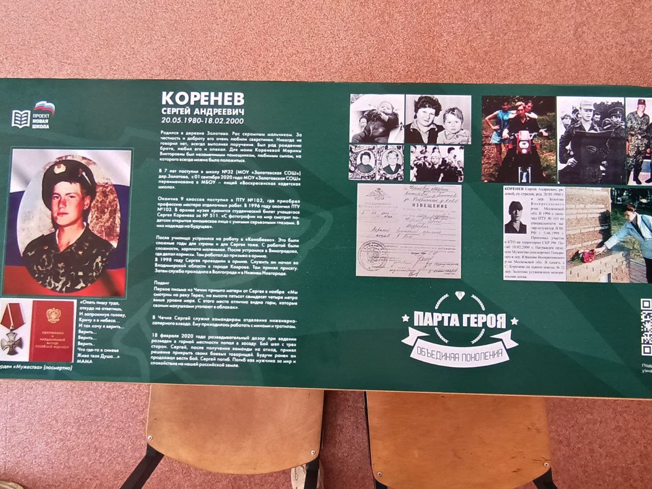 «Парта героя» – это парта с размещенной на ней информацией о заслуженном человеке. Право сидеть за такой партой получают лучшие ученики класса, имеющие успехи в учебе, спорте, творчестве.В Фаустовской школе «Парта героя» открыта и посвящена Сергею Андреевичу Кореневу.