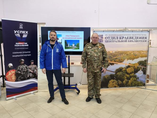 Встреча началась с выступления гостей - депутата Совета депутатов г.о. Воскресенск Дмитрия Муконина и участника СВО Юрия Савченко. Они рассказали о важности событий 1612 года, которые сегодня служат источником патриотизма и примером мужества для нынешних поколений.