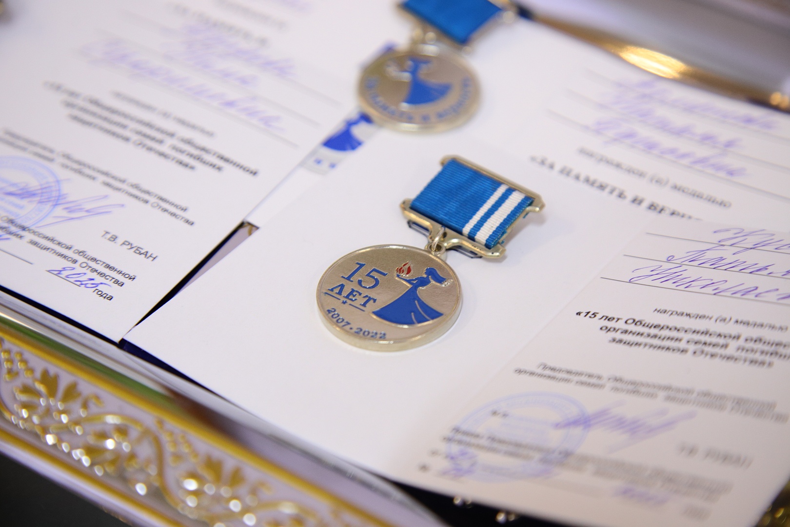 Руководитель Воскресенского отделения ВООВ «Боевое братство» Сергей Устинов наградил памятным знаком председателя Всероссийской общественной организации ветеранов «Боевое братство» Б.В. Громова «Семье погибшего защитника Отечества», а также медалями «За память и верность» и «15 лет Общероссийской организации семей погибших защитников Отечества» матерей и членов семей погибших воскресенцев.