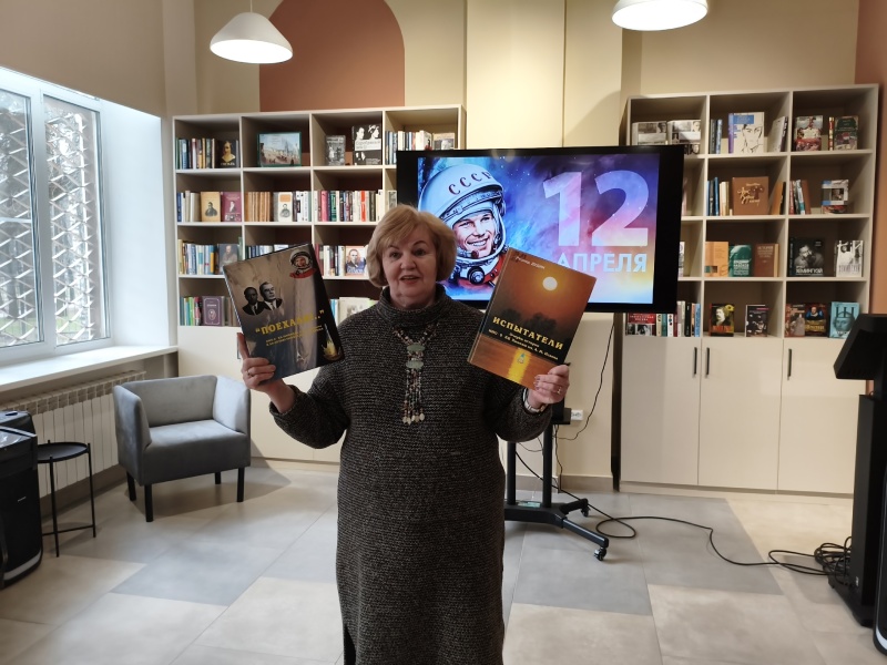 Заведующая отделом краеведения Елена Юрова рассказала о значении первого полёта человека в космос и о судьбе Юрия Гагарина, познакомила всех с книгами об испытателях космической техники и подчеркнула, что в нашем округе живут люди, причастные к великим космическим свершениям.